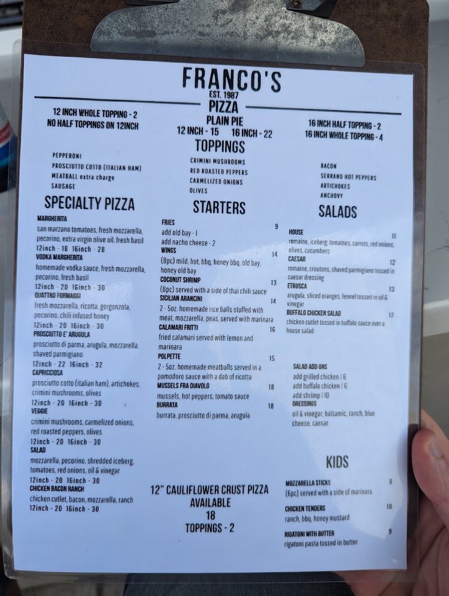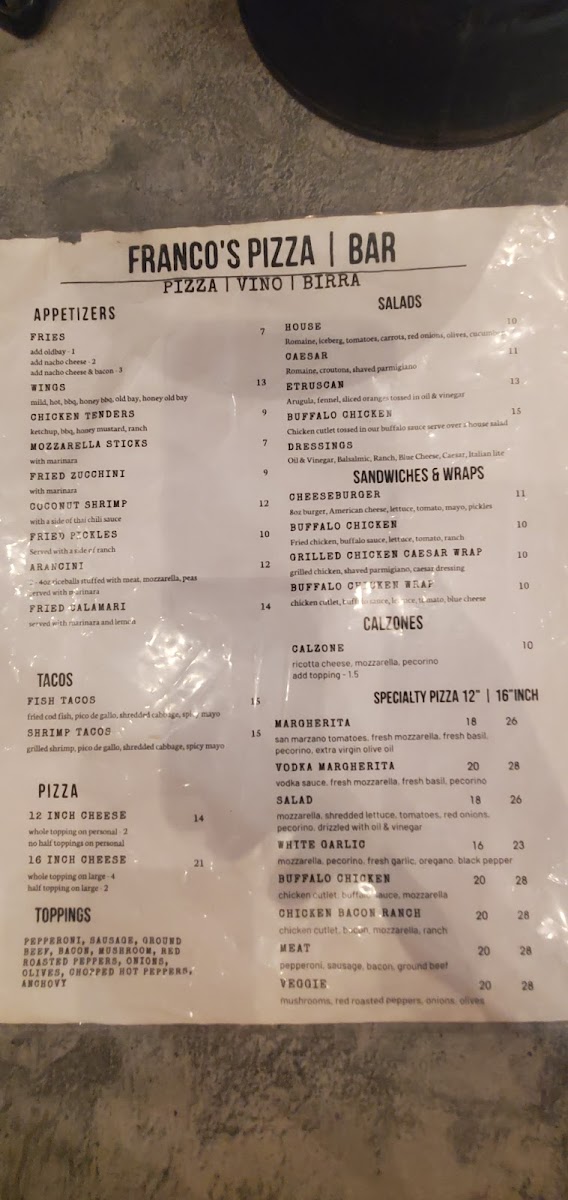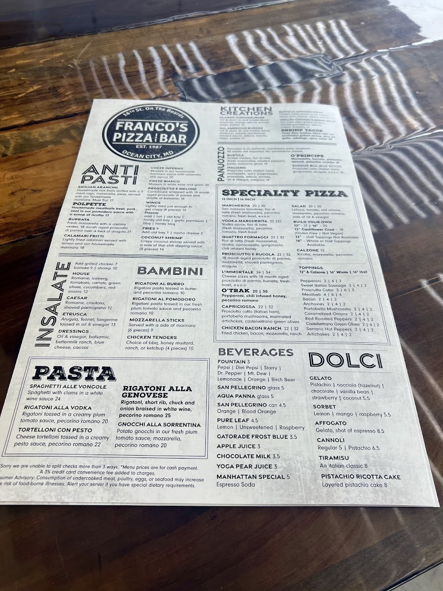 Welcome to Franco's Pizza and Bar, a culinary gem located at 1513 Atlantic Ave, Ocean City, MD. This delightful eatery promises an authentic Italian experience that has won the hearts of many. Customers rave about the exceptional pizza, with its super thin crust and fresh toppings, making it a standout choice for both locals and visitors alike. The pasta dishes, especially when enhanced with succulent shrimp, leave a lasting impression, showcasing the quality ingredients that Franco’s is known for.